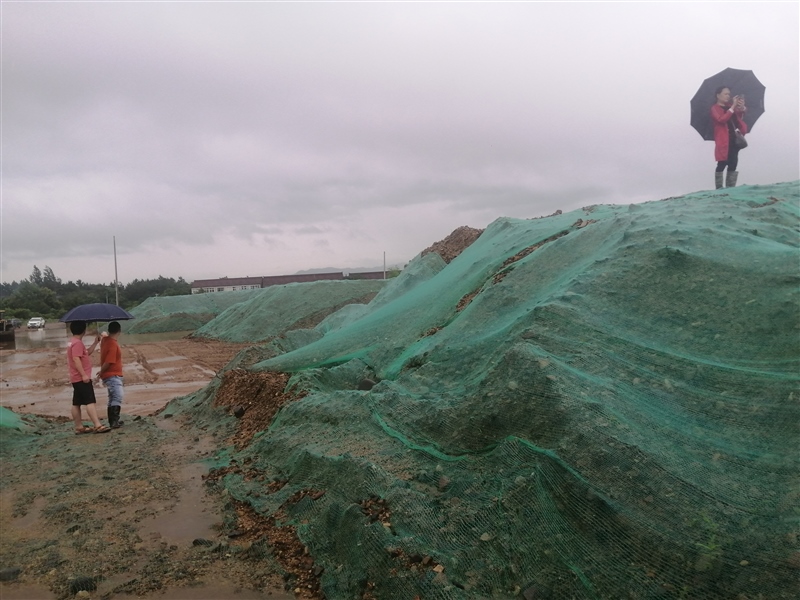 工作人員冒雨帶領客戶查看砂石資源處置現(xiàn)場